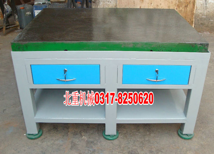 鑄鐵模具平臺(tái)結(jié)構(gòu):制成筋板式和箱體式,工作面有長(zhǎng)方形、正方形或圓形,鑄鐵模具平臺(tái)工作面采用刮削工藝,工作面上可加工V形、T形、U形槽和圓孔、長(zhǎng)孔等。鑄鐵模具平臺(tái)一般人認(rèn)為只要有一定的厚度,那么就不會(huì)發(fā)生形變,其實(shí)實(shí)際上并不是這個(gè)樣子的,鑄鐵模具平臺(tái)的結(jié)構(gòu)工藝也是尤為的重要。鑄鐵模具平臺(tái)結(jié)構(gòu)穩(wěn)定取決于平板的高度,板面的厚度,周邊圍子的厚度,拉筋的厚度及高度。而并不只是在于厚度。鉗工臺(tái)實(shí)心面板厚度為20mm,凈重約1.1T,材質(zhì)為HT200,硬度HB170-240,支架80*80方管,高度為550mm,加支架高度為800mm。
