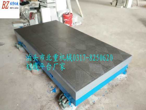 鑄鐵劃線平臺鑄件成形后,進行回火時效,目的是為了消除劃線平臺鑄件的內應力。然后經刨床粗加工,刨去劃線平臺表面粗皮,獲得粗加工精度,然后再一次進行回火時效,消除加工及劃線平臺殘余應力?;鼗鸷蠼洈悼劂姶布庸け砻?,使劃線平臺精度達到規定要求,然后人工刮研排點。